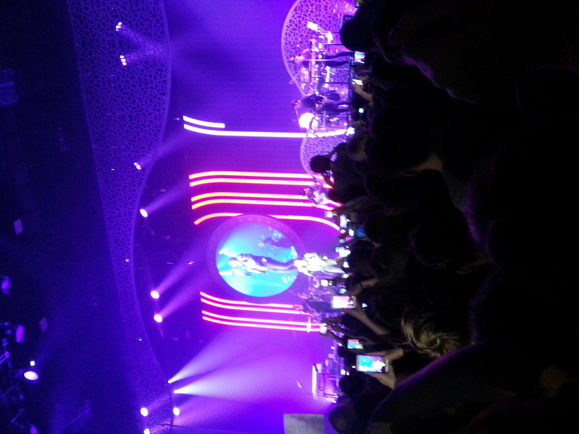 Das Konzert war wirklich große Klasse :love1: :music: Sehr gute Stimmung (das ist ja nix neues :D ) und auch sonst kann sich's sehen/ hören lassen. Seine Musik hat ja ganz allgemein einen hörbaren Einfluss verschiedener spanischer Musik (Stichwort: Gypsy pop, Kendji stammt ja auch einer Roma-Familie) und das kam auch live gut herüber. Er hat sehr oft (spanische) Gitarre gespielt und es gab auch einige Tanzeinlagen. Optisch fand ich die Umsetzung der Stimmung/ Begleitung der Musik gut gelungen. Die Bühnendeko bestand aus einer Art geschwungener Gitter-Elemente + zusätzlicher Video-Wand, die unabhängig von der Hauptwand genutzt werden konnte, mit viel Licht Effekten. Das ist jetzt nicht unbedingt mit dem zu vergleichen ist was bspw. Mylène bringt, wohl eher bspw. mit Zazie - halt alles etwas schlichter aber passend. Wobei die Lichteffekte teilweise durchaus eine Stimmung erzeugt haben die auch zu Mylène gepasst hätten. (siehe Bild)