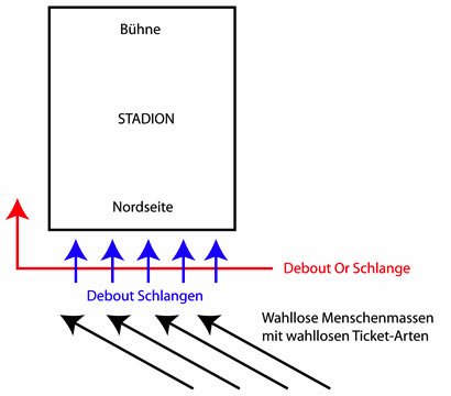Gegen 17:30 war alles nur noch ein chaotischer Haufen, dann begann ab ca. 18 Uhr der "Einlaß" bei "Debout Or". Das nutzten alle vorher irgendwo auf dem Platz lungernden Zaungäste, sich seitlich an die "Debout Or" Schlange heranzuwanzen, bis es im Grunde auch keine Schlange mehr war. Weiterhin merkten dann unzählige "Debout" Leute, daß sich die Schlange in Zeitlupe in eine Himmelsrichtung bewegte, die nicht die ihre war, und sie folglich grade ein paar Stunden falsch angestanden hatten.